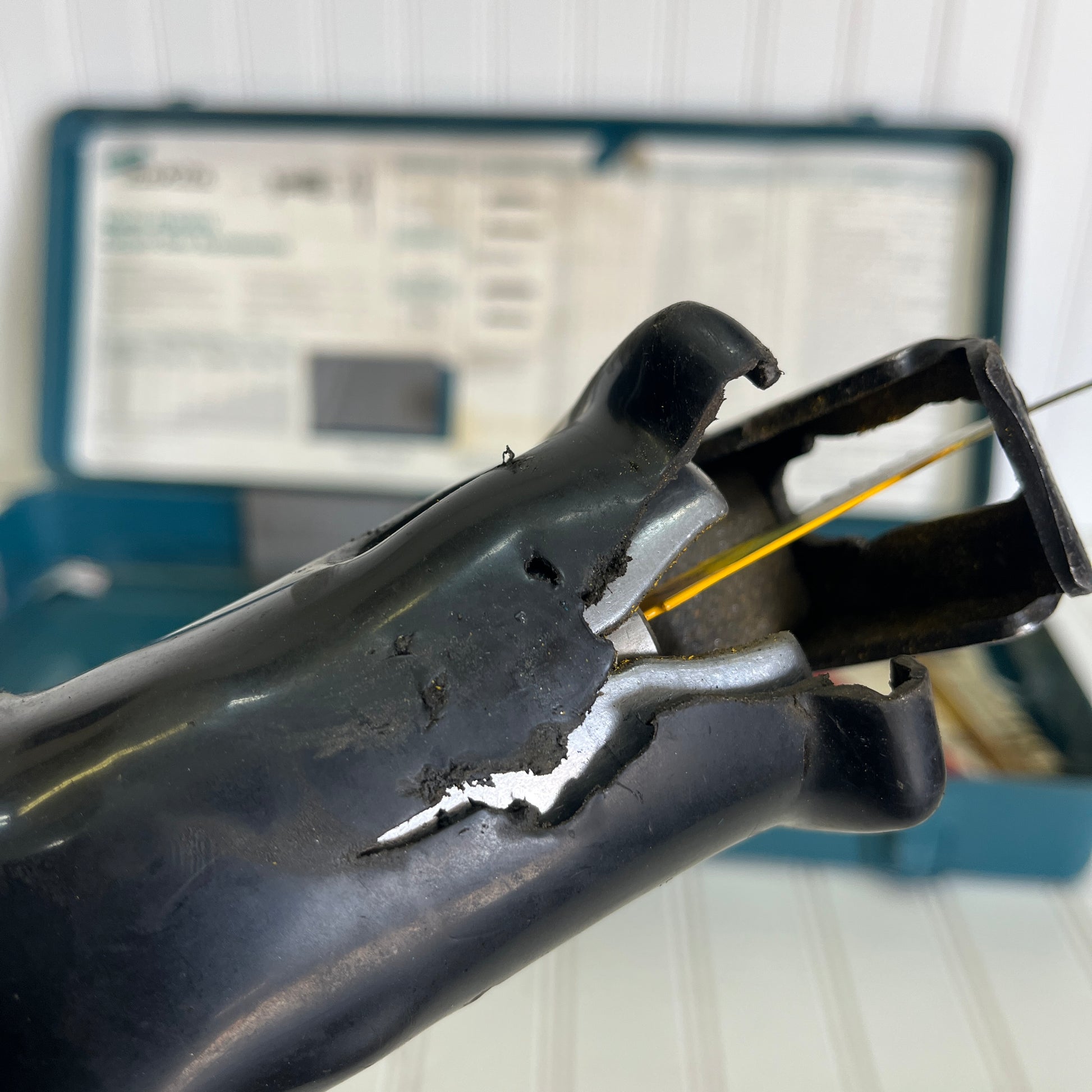 Works well, as shown in video. There is a tear in the rubber case. Priced accordingly.