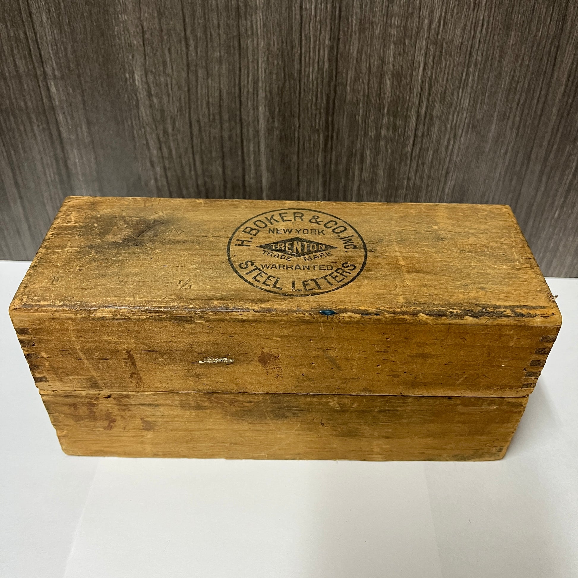 The original wooden storage box keeps the stamps organized, featuring individual compartments for each letter. Known for their high-quality craftsmanship, H. Boker & Co. tools are highly sought after by collectors and tradespeople alike.